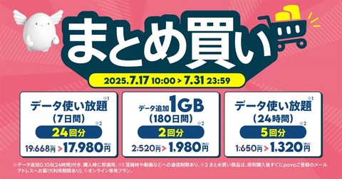 携帯電話サービス「povo2.0」にてまとめ買いにオススメのデータ追加1GB(180日間)やデータ使い放題のトッピングが7月31日まで提供中